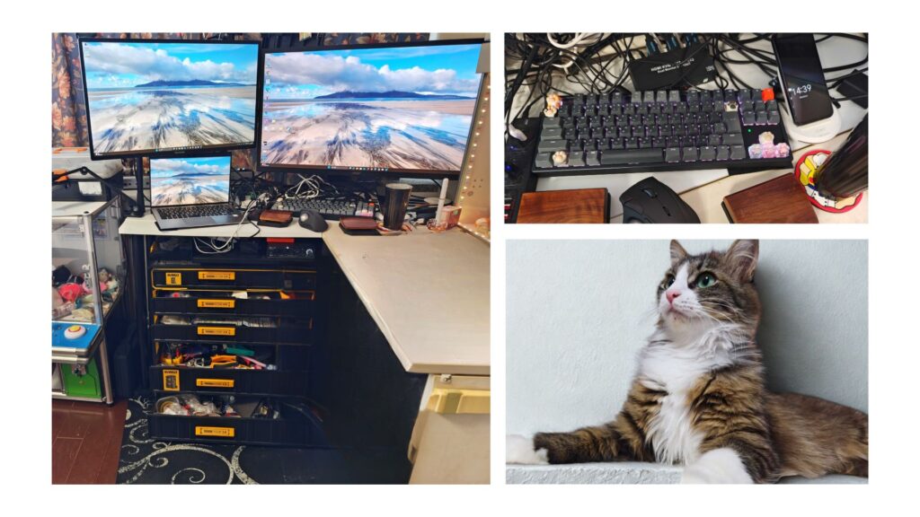 クレーンゲームや工具箱をそばに置きつつ、猫の癒しにも支えられてモチベーションをキープしています。